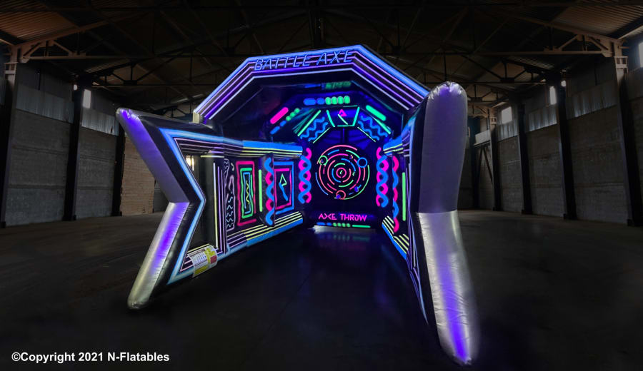 Looking for a unique and thrilling activity to add some excitement to your next event or party? Look no further than our Axe Throwing - Glow in the Dark Edition! A&E Air Jumpers is proud to offer this interactive game that combines the thrill of axe throwing with the mesmerizing glow of black lights. Available for delivery in Sacramento, Roseville, Lincoln, and surrounding areas, this is an experience that will leave your guests in awe.
