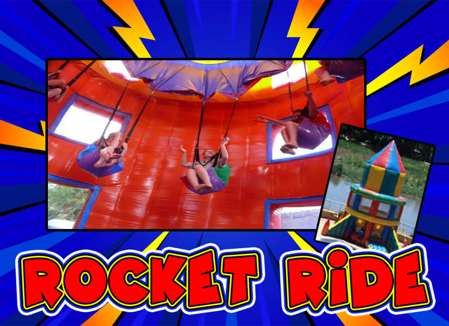 5,4,3,2,1 BLAST OFF . Bring the Rocket Ride to your next party and give the kids an experience they will no soon forget. 1-4 kids climb in and strap in to get blasted 24' up in the air. The center chamber uses air presure to inflate the top which safely life the kids up. Once the center chamber is decompressed the children are brought back to the inflated bottom. Great for 10 and under or anyone under 70lbs. Rent the Rocket Ride for your wedding, sweet 16, over the Hill, graduation party any kind of party the Rocket Ride is a great addition for all the little guest.