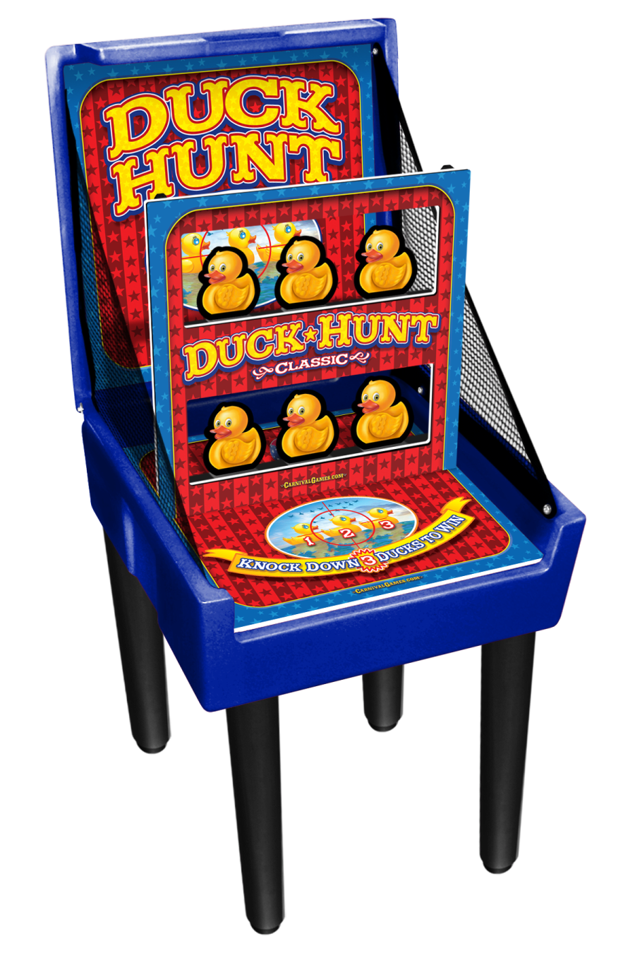 Duck Hunt classic carnival game rental come with legs that stand about 4' tall making it perfect for school age kids right at their height. The game can also be place flat on a table top making it perfect for older kids and event adults.