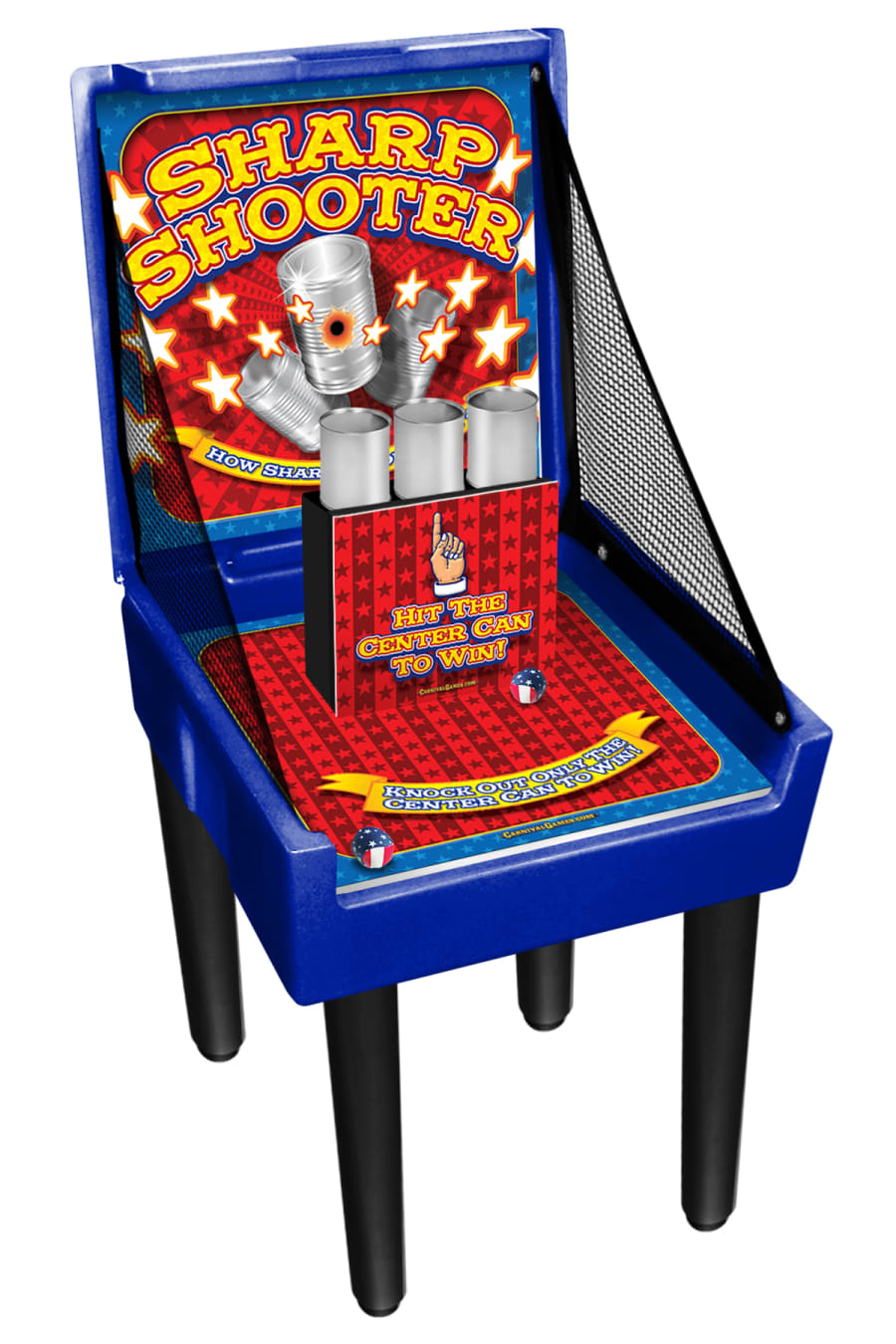 Sharp Shooter Classic Carnival Game Rental come with legs that stand about 4' tall making it perfect for school age kids right at their height. The game can also be place flat on a table top making it perfect for older kids and event adults.