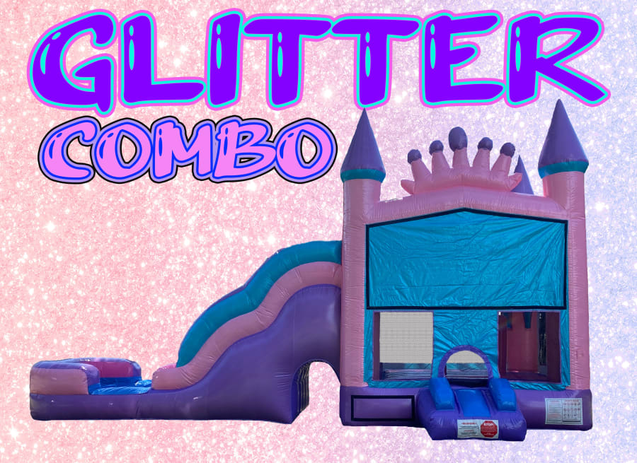 Pretty-n-Pink Glitter combo for rent Sacramento is a full size standard bounce house 13x13 unit with a tall, long slide attached on the side. Pretty-n-Pink Glitter combo for rent Sacramento is a larger combo unit and offers 6 different actives for the kids to enjoy. Every little girl with fall in love with this cute, Pink and purple combo unit and her and her friends will enjoy jumping, sliding, climbing, bouncing their way into the best birthday party ever. Pretty-n-pink glitter combo unit rentals has a little something for everyone and even comes with an inflatable basketball hoop on the inside. Pretty-n-pink glitter combo for rent requires a long narrow space approx. 32 long x14 wide x16 tall, it still fits in most larger yards and requires a long narrow space. Pretty-n-pink glitter combo for rent features the tallest slide available in a combo unit; because of the height of the slide it is recommended for children 4 years or or older, or younger children that can climb really well. If you have a princess in your life and are looking for the perfect princess party idea this combo rental Sacramento is for you. The Pretty-n-pink combo for rent also can be used with water and the huge slide can be transformed into a water slide complete with a pool at the bottom.
