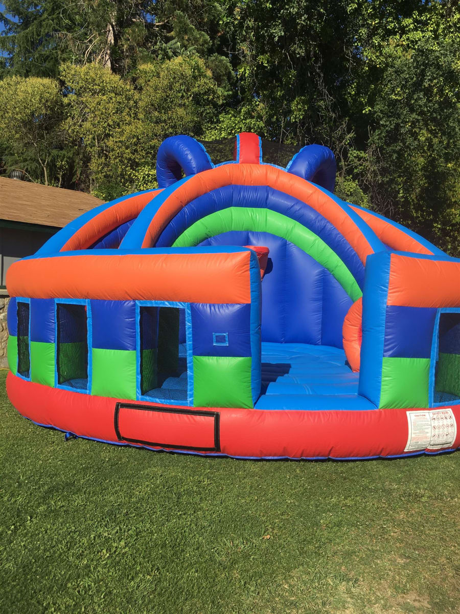 Rockin round combo for rent Sacramento is a large combo measuring 26' in diameter. Rockin Round Combo for rent Sacramento features an extra large bouncing area with attached curved slide wrapping along the top back side. Rockin round combo for rent Sacramento also has pop up obstacles all making this a excellent combo for rent Sacramento. Rocking round combo for rent Sacramento is perfect for large groups of children and kids of all ages will have a jumping good time! Rocking round combo has everything including a basketball hoop and a large bouncing area making it perfect for a basketball game.