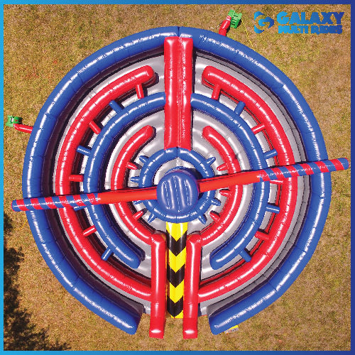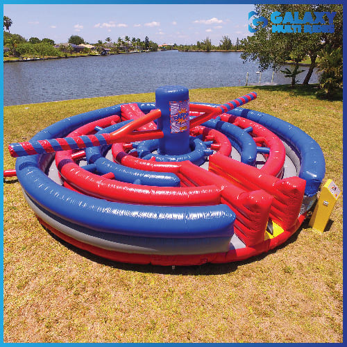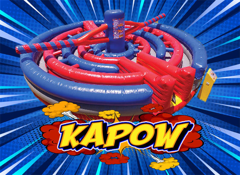 2 players enter the Kapow Interactive Obstacle Course ride all while ducking and dodging the swinging pendulum as it spins around trying to know them down. One player goes right, one goes left and runs threw the circular obstacle course while ducking the pendulum both from the front and back. The first player that finishes the obstacle course wins. Don't stop there you can create teams and once that rider is done they send the next rider in. The Kapow Interactive Obstacle Course can be played endless number of ways all while being the hit of the party. Kapow Interactive Obstacle Course rental design allows for multiple riders to compete at a time making this a great selection for a large group event.