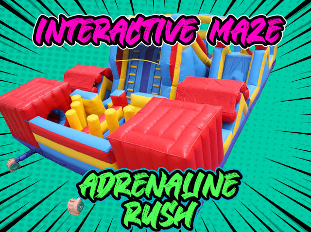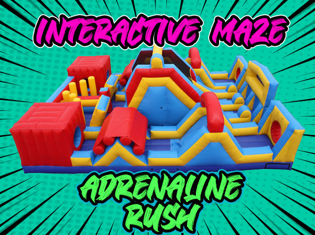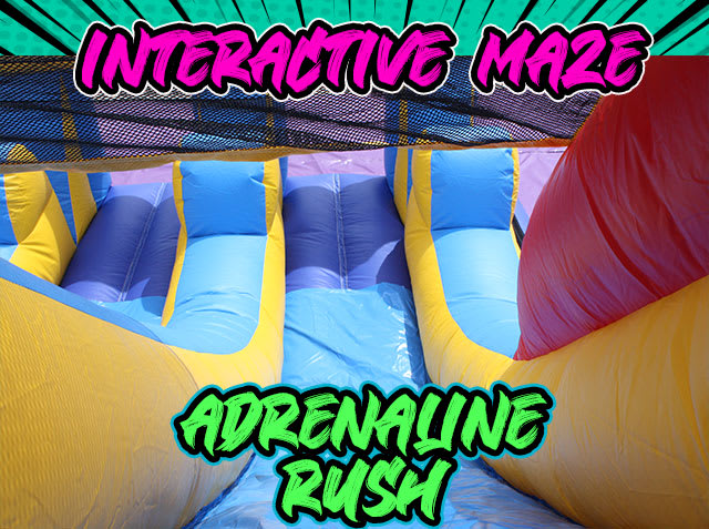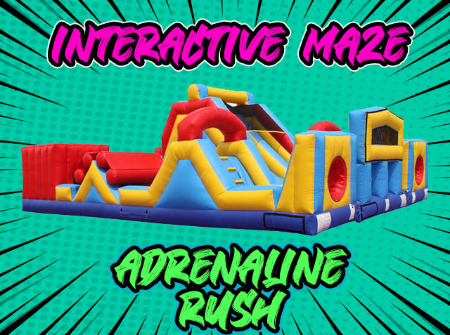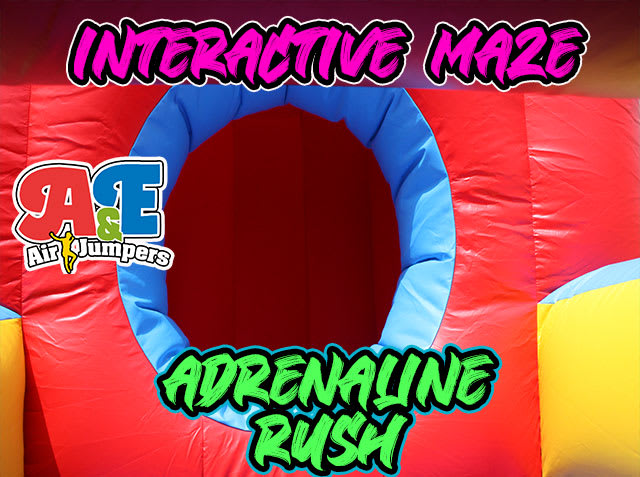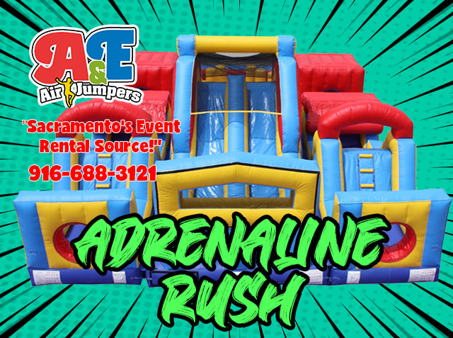 Adrenaline Rush Inflatable Maze Giant Obstacle Race For Rent 916-688-3121 AE Air Jumper Sacramento Adrenaline Rush Inflatable Maze Giant Obstacle Race For Rent 916-688-3121 AE Air Jumper Sacramento's Event Rental Source The Adrenaline Rush Inflatable Maze is one of AE's largest obstacle course for rent. Each player starts at the beginning of the course. Ready, set, got it is a race through over 200 feet of inflatables obstacle course and maze to the end. Will you beat the other side? First man down the slide and out the exit wins. See the Adrenaline Rush in action in this video. Perfect for family BBQS. This inflatable obstacle rental features and panel front that will allow you to customize your event. We do custom artwork. Ask us about our event planning services today.