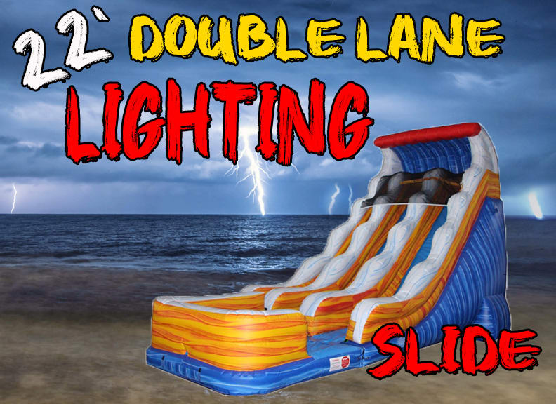This 22' double lane lighting water slide can be used wet or dry. This 22' double lane lighting water slide is the perfect slide for kids of all ages all the way up to adults that still think they are children (we all know that we have a few of these in our family). The double lane lighting water slide is filled with endless hours of fun, Sure to be the hit of any party.