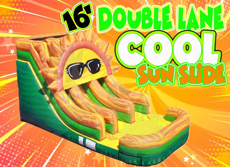 16' double lane COOL Sun slide rental Sacramento with it's new design sure to be the hit of any party. The 16' double lane cool sun slide rental is perfect for kids of all ages. 16' slides are perfect for younger kids but also works with older children and even young adults. The kids love bounce houses what they love more then bounce houses is a slide rental Sacramento! The 16' double lane cool sun slide rental is 14' wide x 28' long x 16' tall making it perfect for most yards in Sacramento. The 16' double lane cool sun slide has a full inflatable landing pad at the bottom of the slide rental Sacramento. The 16' double lane cool sun slide rental has a platform height (platform is where you sit down to slide down) of 10' and has the tallest platform height for a 16' double lane cool sun slide rental. The 16' cool sun slide double lane slide rental is the a great slide rental choose and will fit into most budgets and yards.