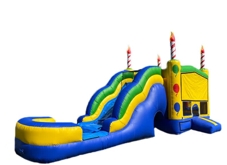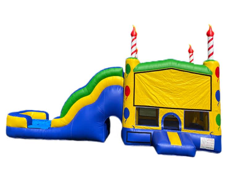 The Water Birthday Cake combo for rent is a "wet" water unit. The pool at the bottom of the slide fills up with water making a pool at the end of the carnival top combo unit rental. The Birthday Cake combo bounce house for rent unit is a larger combo unit for rent Sacramento. Birthday Cake combo for rent brings the feel and atmosphere of a real carnival circus top. Jump, slide, climb, bounce your way into the best birthday party ever. Birthday Cake combo for rent requires a long narrow space approx. 32 long x13 wide x16 tall, it still fits in most yards but it requires a long narrow space. This 5n1 Birthday Cake combo for rent features the tallest slide available in a combo unit; because of the height of the slide it is recommended for children 4 years or or older, or younger children that can climb really well. If you are having a carnival theme party this is the must have unit for you. For those long HOT summer days the Birthday Cake 5n1combo unit for rent can be used with water and the huge slide can be transformed into a water slide complete with a pool at the bottom.