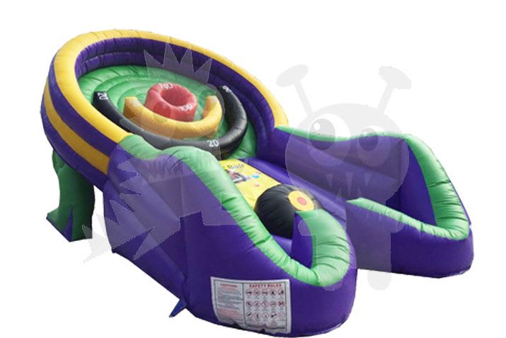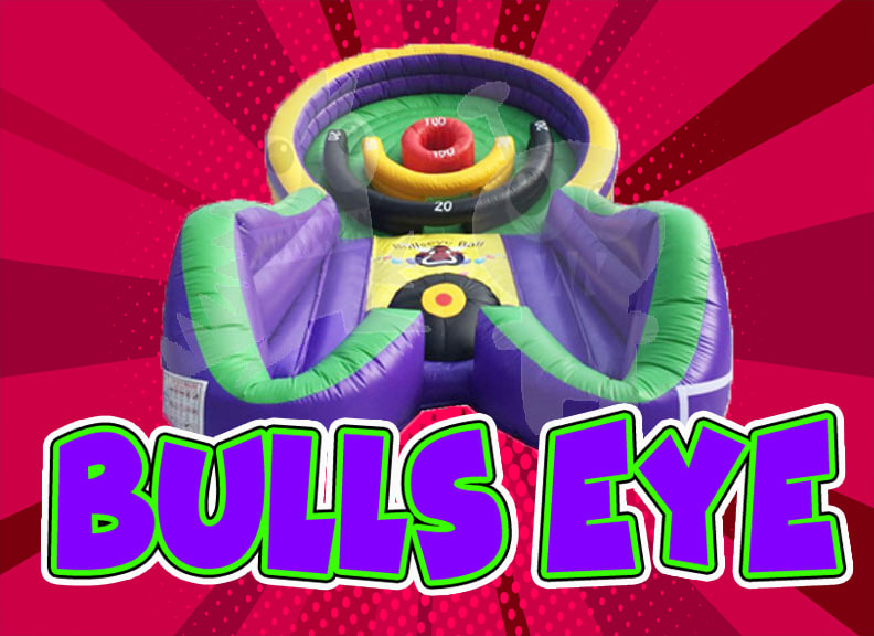 Inflatable Bulls Eye carnival game rental is played by 1 player. There is a target at the base of the bulls eye. You take a ball and bounce the ball off the target to aim for the different targets above that are worth different values depending on their difficulty. Similar concept to skee ball but instead of rolling the ball at the targets you are bouncing the ball at the targets.