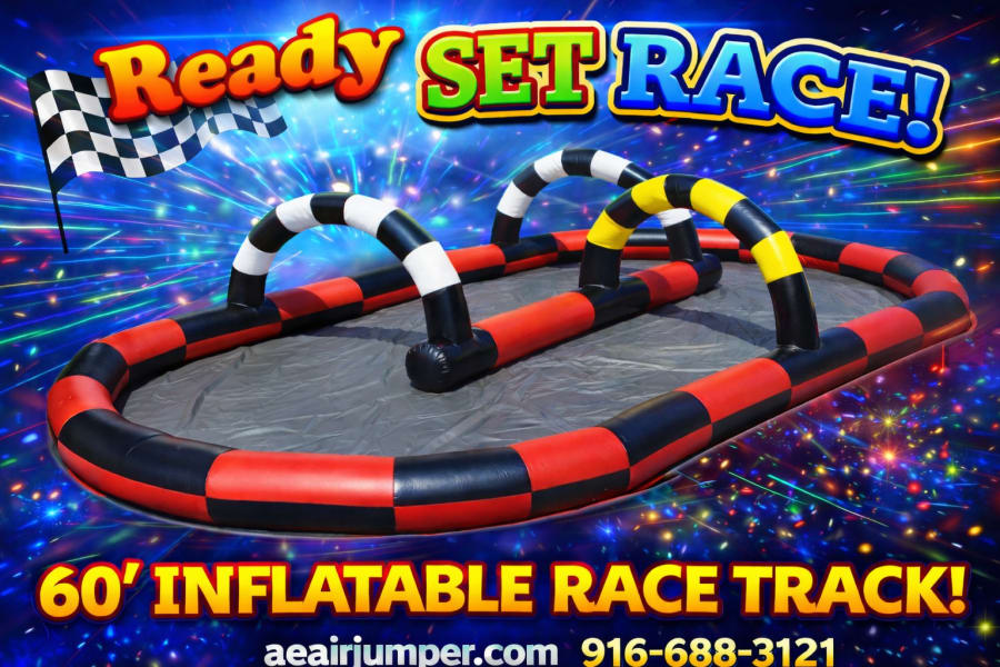 Ready Set Race .... this inflatable race track is sure to be the hit of your party, event, fair, festival, church fundraiser, school carnival, or your private birthday party. Larger then life this Inflatable Race Track for rent Sacramento is any Racer's Dream to have at their Party. The Giant 60' Inflatable Race Track can be used for any type of race. A&E Air Jumpers Party Rentals has a large selection of items that can be used with the inflatable race track for rent Sacramento. For pictures and prices check out our Extreme Rides and Interactive Sports and games section. A&E Air Jumpers has a large selection of items that are rented when you rent the inflatable race track for rent Sacramento. Some of the fan favorite racing games we have are our Giant Tricycles, Zorb balls, or Zoonimals. We also have the area's largest selection of Segway Scooter products in Sacramento, Segway Scooter Rentals, Segway Self balancing Scooter rentals, Segway Mecha Attach Racers, and don't forget Segway Go-Kart Racers for rent Sacramento. Inflatable Race track for rent Sacramento can be rented by it's self or combined with on of out interactive race games we have to offer. Rent the Inflatable Race Track Interactive today.