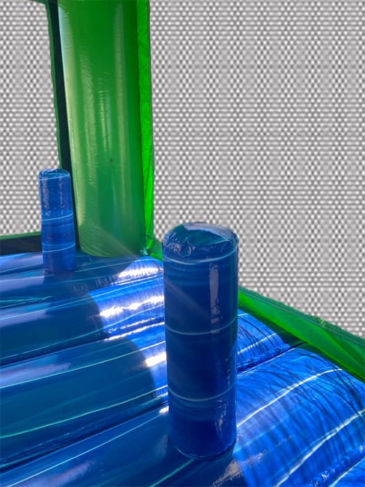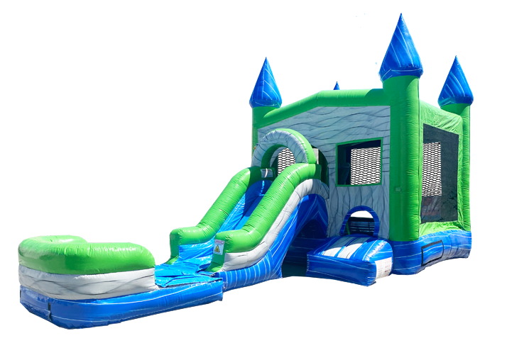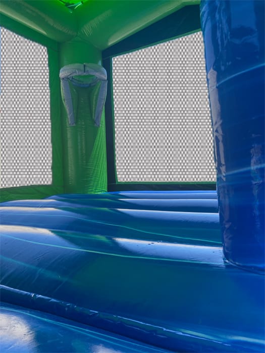 The Green Venom Combo jumper slide combo is a compact bounce house combo unit. It compact size makes it a perfect size allowing it to fit in most yards. The Green Venom Combo jumper slide combo is a great unit to sit back and enjoy watching the kids in. The design of the jumper combo males keeping the kids in one location easy; The exit (the slide) and the entrance are all on one side making supervising a breeze. The Green Venom Combo bounce house slide combo unit for rent can also be turned into a summer time bliss when the water slide feature is selected. The Green Venom Combo jumper combo features a basketball hoop on the inside with pillar pop up the kids love to push down and jump on. Green Venom Combo jumper combo is a perfect fit for all kid up to 10.