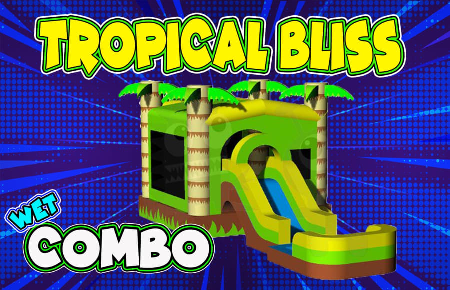 Everything wet is always better for those HOT summer days in California. The Tropical bliss water palm jumper combo is a compact bounce house combo unit. It compact size makes it a perfect size that allows it to fit in most yards. The topical bliss water palm jumper combo is a great unit to sit back and enjoy watching the kids in. The design of the bounce house water combo males keeping the kids in one location easy; The exit (the slide) and the entrance are all on one side making supervising a breeze. The tropical bliss palm water bounce house combo unit for rent is a summer time bliss with the splash landing at the end of the slide. The tropical bliss palm water jumper combo features a basketball hoop on the inside with pillar pop up the kids love to push down and jump on. Tropical bliss palm water jumper combo is a perfect fit for all kid 10 and younger.