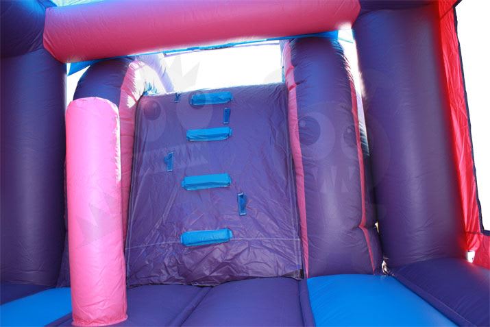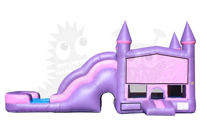 Pretty-n-Pink water combo for rent Sacramento, is just what you are looking for to cool off on those hot summer days. Pretty-n-pink Water inflatable combo rental is a full size standard bounce house 13x13 unit with a tall, long slide attached on the side. Every little girl with fall in love with this cute, Pink and purple combo unit and her and her friends will enjoy jumping, sliding, climbing, bouncing their way into the best birthday party ever. Make the pretty-n-pink water combo rental even better by choosing 1 of our over 50 to choose from cartoon jumper panels. In just seconds our pretty-n-pink can be transformed into your child's favorite cartoon jumper with her favorite princess on the front. Pretty-n-Pink water combo for rent Sacramento is a larger combo unit and offers 6 different actives for the kids to enjoy. Pretty-n-pink water combo unit rentals has a little something for everyone and even comes with an inflatable basketball hoop on the inside. Pretty-n-pink water combo for rent requires a long narrow space approx. 32 long x14 wide x16 tall, it still fits in most larger yards and requires a long narrow space. Pretty-n-pink water combo for rent features the tallest slide available in a combo unit; because of the height of the slide it is recommended for children 4 years or or older, or younger children that can climb really well. If you have a princess in your life and are looking for the perfect princess party idea this combo rental Sacramento is for you. The Pretty-n-pink water combo for rent also can be used with water and the huge slide can be transformed into a water slide complete with a pool at the bottom.