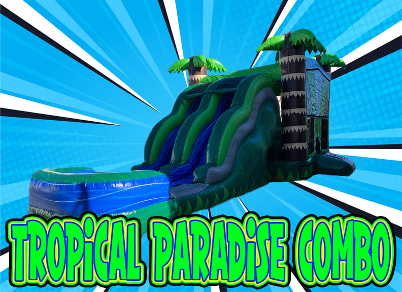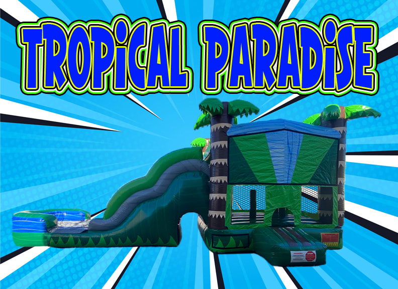 Our Tropical Water Paradise 5n1 combo is a bounce house and slide rental combined and is the touch your Luau party needs. There is no better unit to beat the heat with. The Tropical Paradise bounce house combo is one of our many combo units that turns into a water paradise. The Tropical Water Paradise combo rental Sacramento features 3D palm trees at the top of the pillars. Tropical Water Paradise combo is a standard size bounce house, 13x13 with a slide attached and is perfect for a jumping good time! The tropical water combo features 6 actives that will keep the kids entertained all day long. They will have a blast, jumping, climbing, sliding, and even playing basketball with the inflatable hoop inside. Tropical Water Paradise bounce combo rental is on the larger side of the combo units measuring 32 (left to right), 14 (front to back) and 16' tall. The Tropical Water Paradise bounce combo unit is perfect size to fit in most larger yards. Tropical Water Paradise bounce combo has one of the tallest slide platform in combo units. Due to its tall slide platform this unit is recommend for children 5 and older or younger children that are good climbers. This unit features a basketball hoop on the inside with pillar pop up the kids love to push down and jump on.